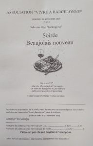 L’association Vivre à Barcelonne vous propose pour la 2ème année une soirée beaujolais nouveau.